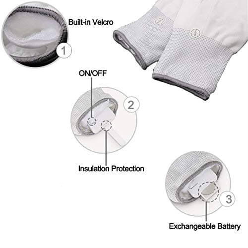 Each set of gloves includes a small battery pack built into the gloves and has a button that controls LED modes. The battery pack uses two CR2016 replaceable batteries (included) and lasts several hours of continuous use. The batteries can be replaced opening the velcro fabric near the wrist and carefully sliding out the battery tray.